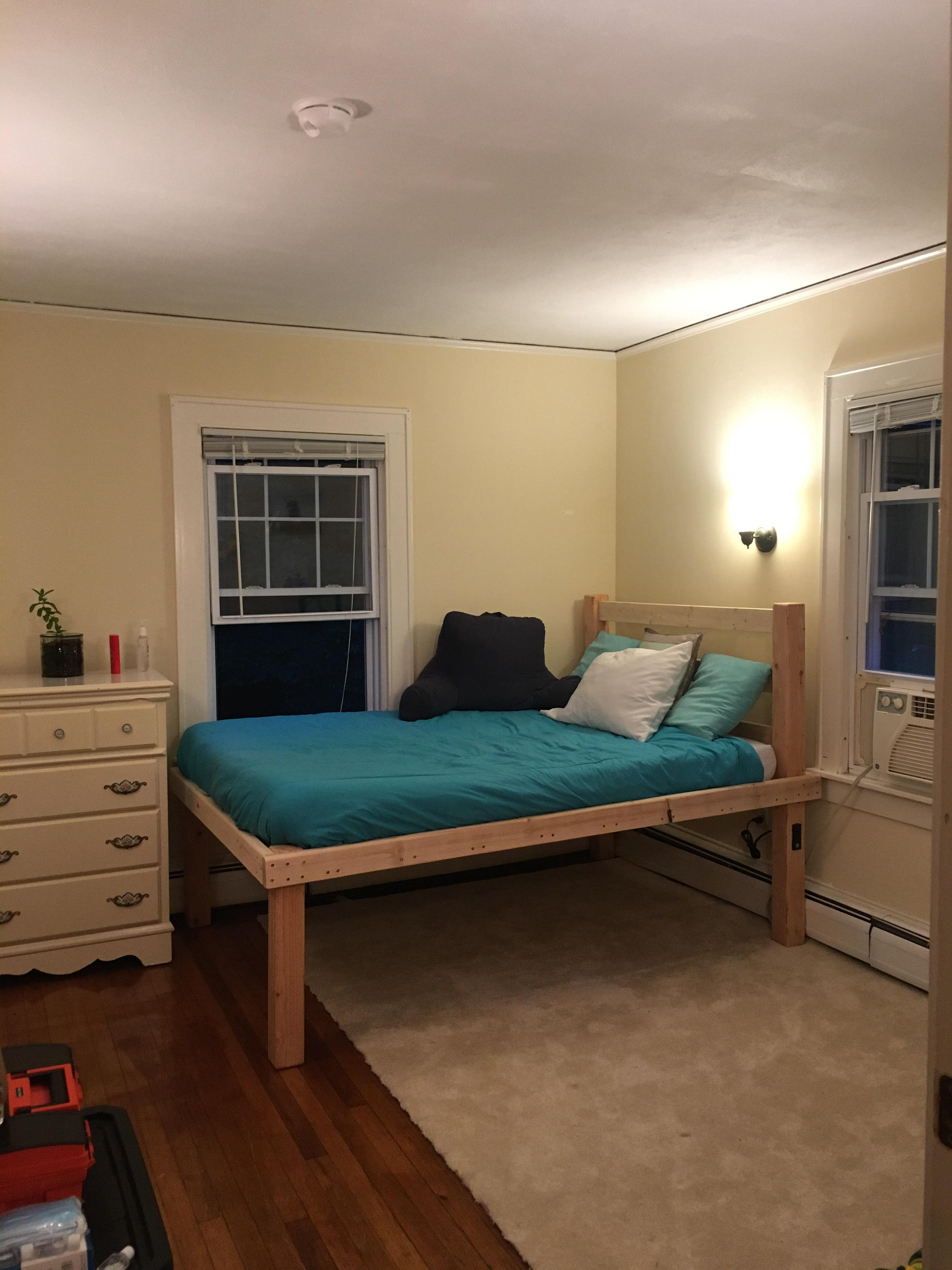 The below image shows the assembled and installed bedframe! It works great, and was very fun to make!
