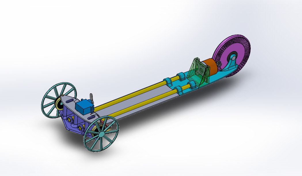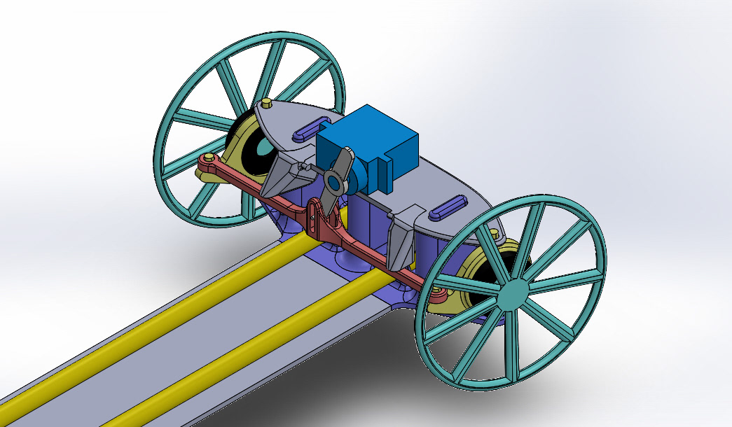 The most complex system is the steering assembly. Each wheel is directly mounted to a skateboard bearing for minimal rolling friction. The bearings are mounted within the yellow component, and are restricted to a single degree of freedom. The maroon connecting rod attaches to both bearing mounts, and ensures that the wheels turn equally. A single 9g servo is mounted on top of the assembly. With proper electronic control, the servo is actuated to steer the car. This design allows the wheels 120° of freedom to turn the car, and was modeled from scratch for this project.