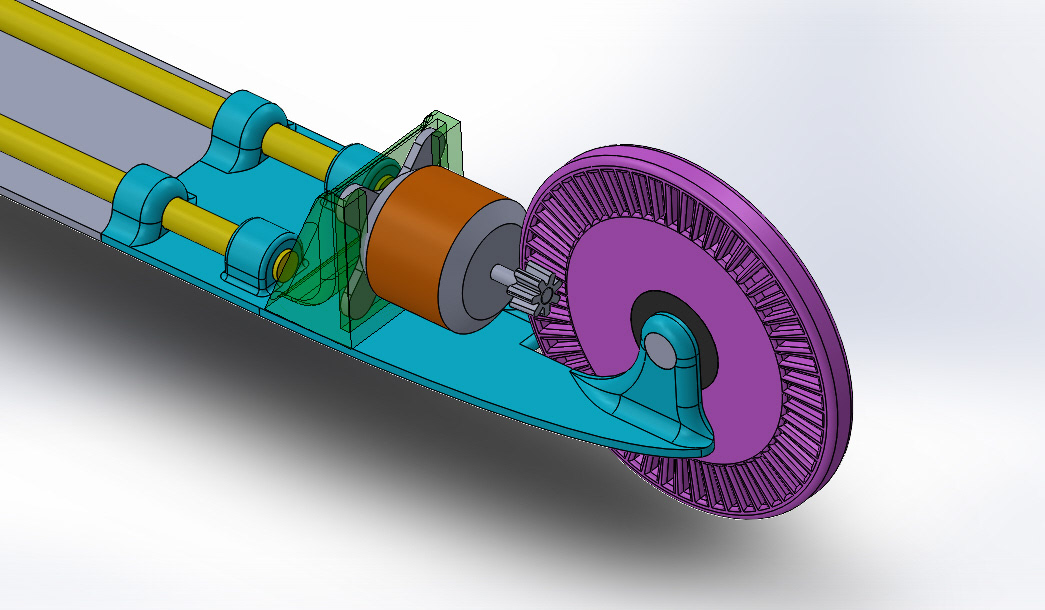 The drive system for the car uses a single A2122 brushless DC motor. A pinion gear is mounted to the motor's shaft, which in turn directly drives the rear wheel. This design allows for a very high torque output to the rear tire. Additionally, the translucent green component can be repositioned to accommodate different gear ratios. This adjustability allows for future iterations and design changes to be incorporated easily.